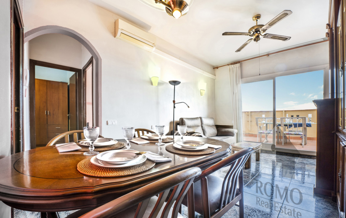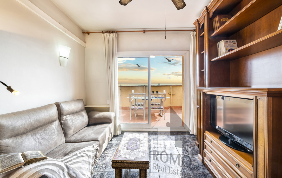 La terrassa flueix amb el saló quan les balconeres estan obertes, només les cortines de gasa ens marquen on comença un i acaba l’altra, és un saló molt lluminós, també un mirador de luxe, el mar de fons dibuixa una postal preciosa.
