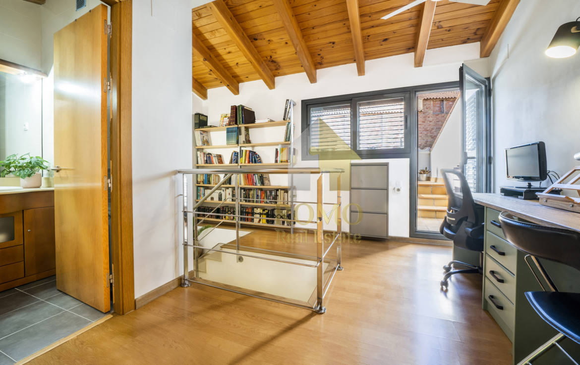 Pugem al refugi privat per un tresor escalonat de llibres, una escala biblioteca, travessarem un despatx i la resta de dormitoris sota bigues de fusta i finestres per on entren raigs de llum tot el dia. Ja entreveiem aquest espai increïble que amplia molt l’interior de la llar, la terrassa enrajolada i en blanc Formentera, un racó de lectura, el chillout o l’amagatall ‘secret’ ¿Sortim? ¡avui dinarem fora!