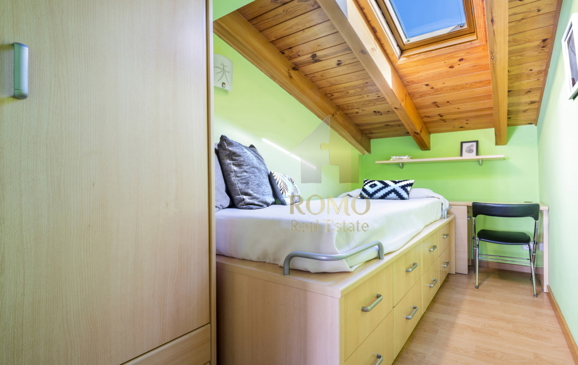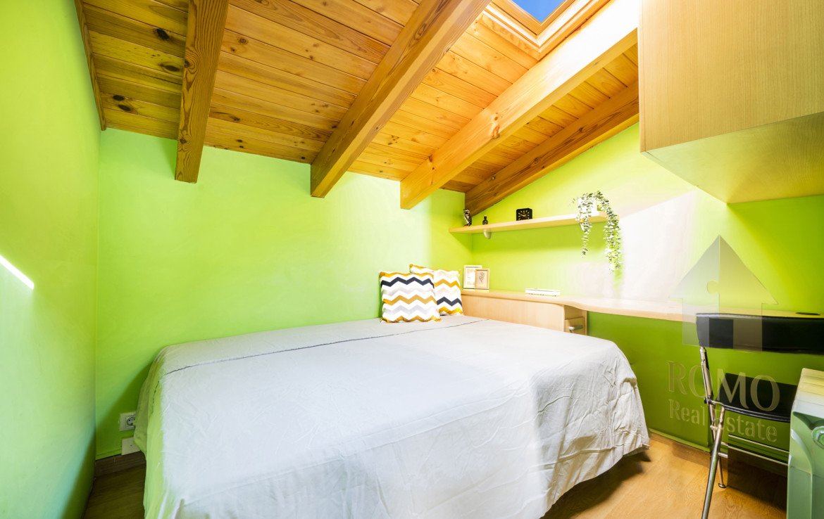 A la planta baixa tenim un dormitori tan de moda, unint el que és actual i el que és tradicional, abraçat per la fusta i les vistes urbanes podrem cantar això de “un raig de llum que va entrar per la meva finestra”