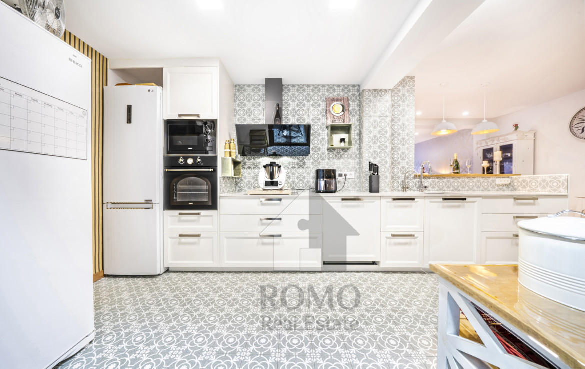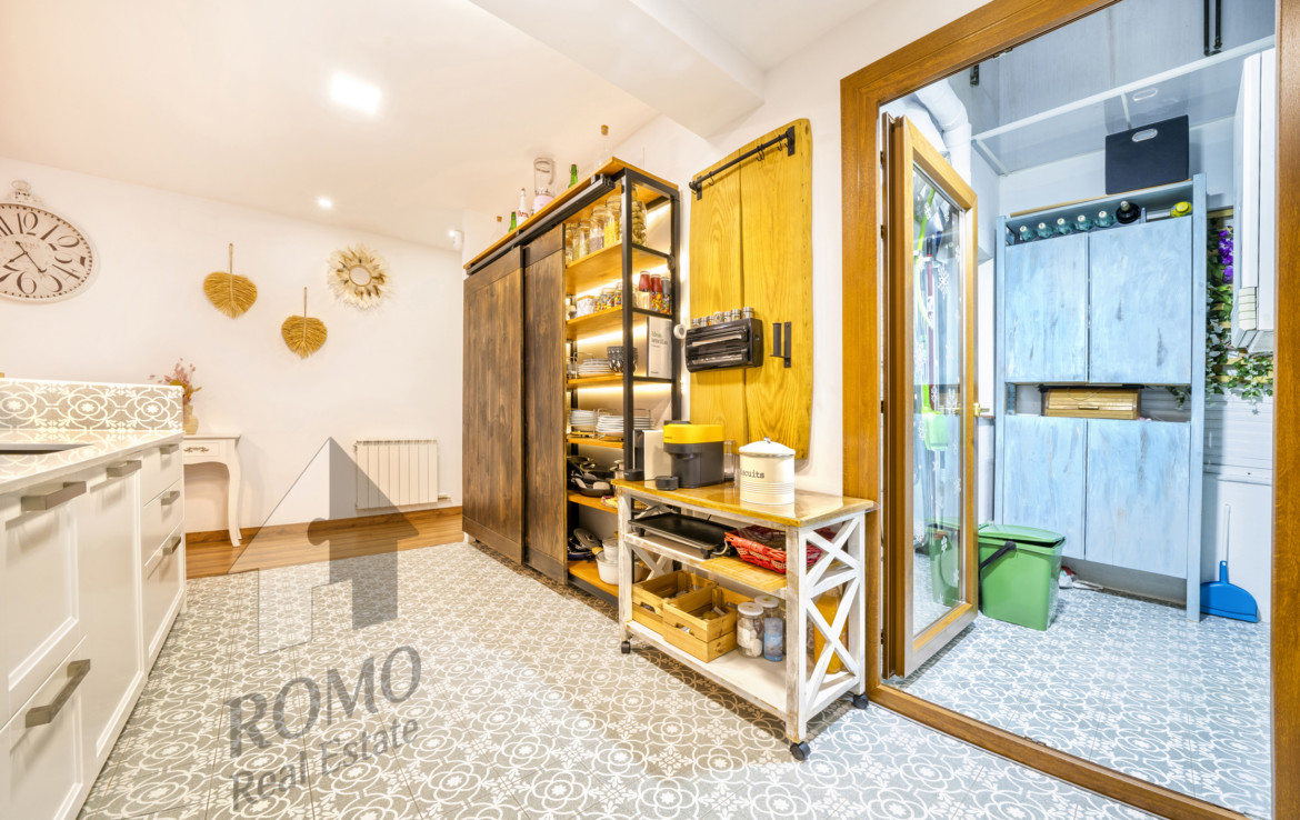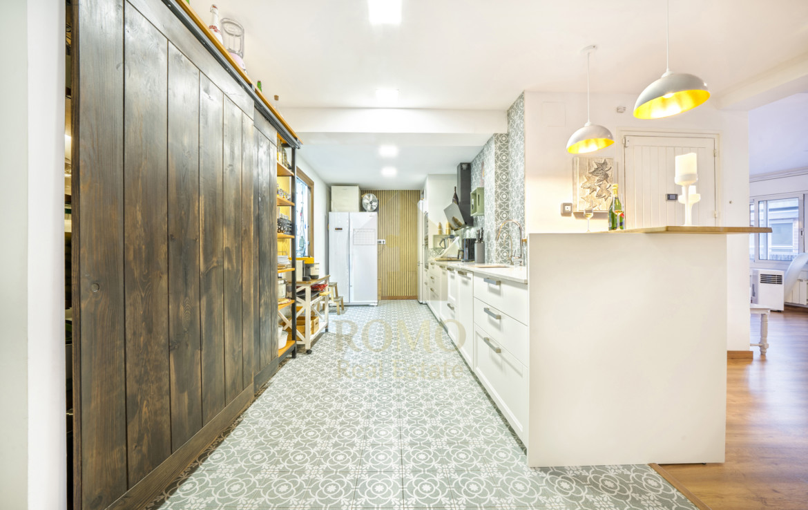 La cirereta del pastís és una gran cuina d’autèntic xef, tradició, modernitat i encant amb un toc original al parquet que combina una catifa de mosaic hidràulic, això si totes les mirades se’n van a l’exquisit armari-rebost de portes corredisses de fusta i a la barra esmorzera, o, segons el moment ¡Xampagnera!