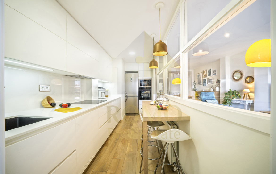 Per sumar metres a l’espai, van treure la zona del rebedor i el van unir al saló menjador que, alhora, per guanyar llum comunica amb la blanca cuina, un lloc ideal per estar en família i gaudir-ne a través d’uns espectaculars finestrals anglesos mentre cuines ¡oïda Xef!